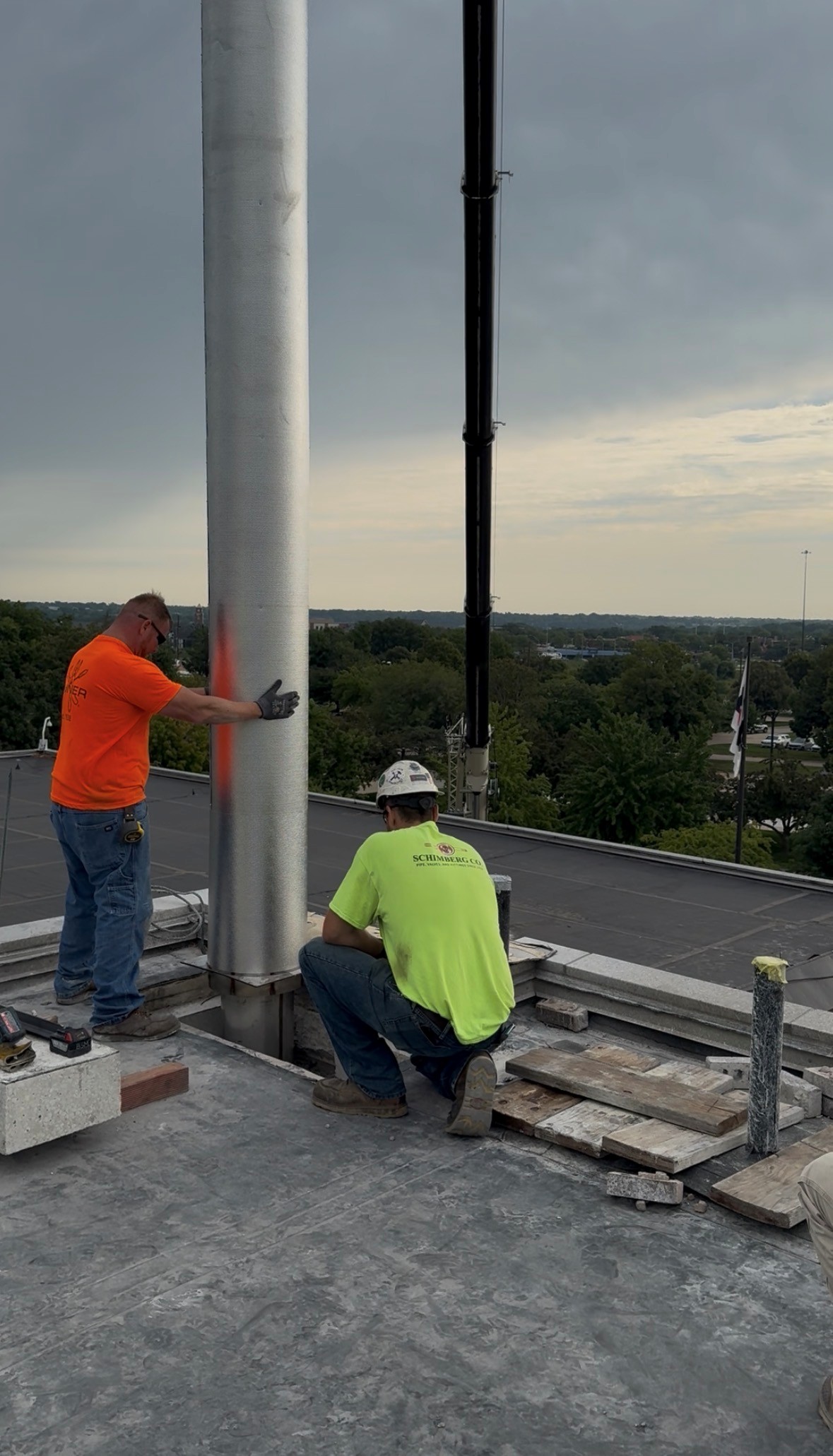 Selected as the mechanical contractor for the replacement of this 12,000 MBH central boiler plant, we were tasked with replacing four boiler flues, buried in a shaft behind elevators. The plans called for demo of the elevator bank and shaft for replacement of the flues. We were able to prefabricate and insulate these forty-foot flues and install them with no disruption to the elevator bank and provide great savings to our customer.